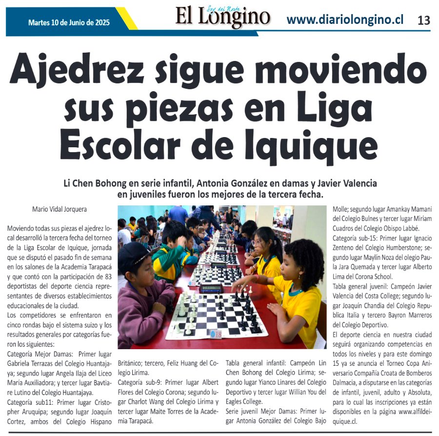 Liga Escolar 2025Noticias Regional El Longino – Ajedrez sigue moviendo sus piezas en Liga Escolar de Iquique 10 de Junio de 2025 jsilva