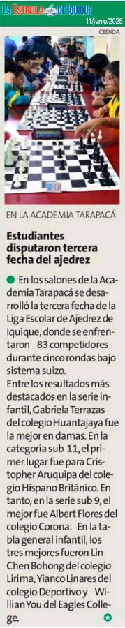 Liga Escolar 2025, Noticias Regionales La Estrella – Estudiantes disputaron tercera fecha de ajedrez Written by jsilva on 11 de Junio de 2025 More in Liga Escolar 2025: El Longino – Entre torres, peones y alfiles se disputó la final regional del ajedrez escolar 4 de Noviembre de 2025 El Longino – Deporte ciencia busca clasificar a representantes para Juegos Deportivos Escolares 17 de Junio de 2025 El Longino – Ajedrez sigue moviendo sus piezas en Liga Escolar de Iquique 10 de Junio de 2025