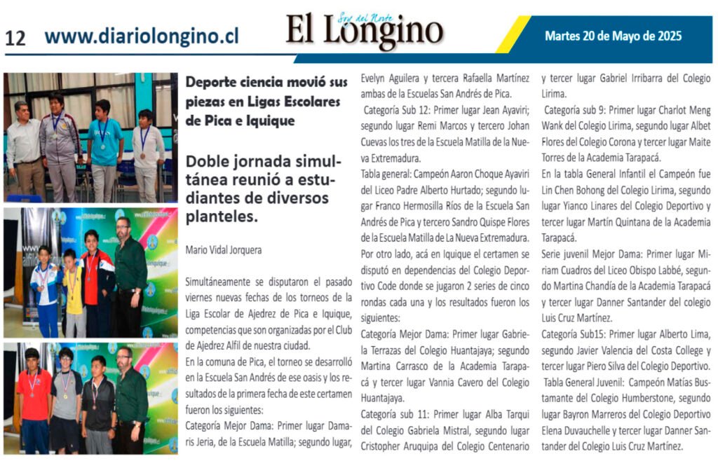 Liga Escolar 2025, Noticias Regionales El Longino – Deporte ciencia movió sus piezas en Liga Escolar de Pica e Iquique Written by jsilva on 20 de Mayo de 2025 More in Liga Escolar 2025: El Longino – Entre torres, peones y alfiles se disputó la final regional del ajedrez escolar 4 de Noviembre de 2025 El Longino – Deporte ciencia busca clasificar a representantes para Juegos Deportivos Escolares 17 de Junio de 2025 La Estrella – Estudiantes disputaron tercera fecha de ajedrez 11 de Junio de 2025