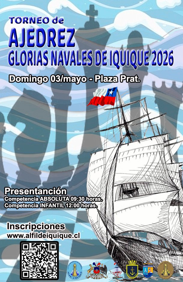 Torneo de Ajedrez Glorias Navales de Iquique 2026 01.-BASES 02.-Inscripción en linea – Torneo INFANTIL. (Jugadores creados) 03.-Inscripción en linea – Torneo ABSOLUTO. (Jugadores creados) 04.-Solicitud creación de jugador en AJEFECH.